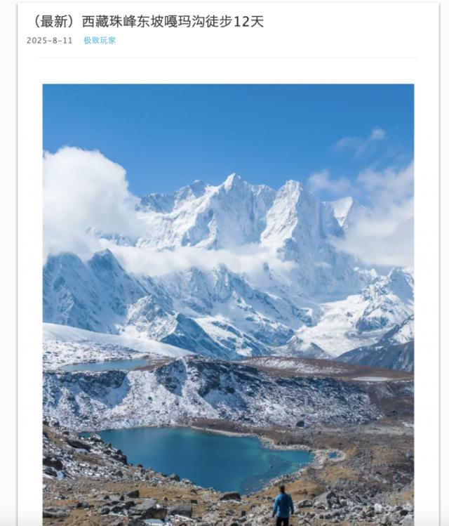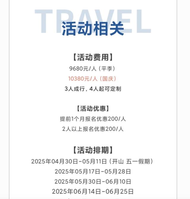 该工作人员提供的行程报价显示,淡季价格为 9680 元 / 人,国庆黄金周期间则上调至 10380 元 / 人。整个行程历时约 12 天,其中徒步路段总里程 79 公里。该社全年共开设 12 个出发排期,覆盖整个可徒步时段。