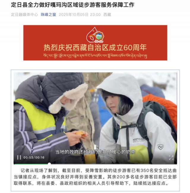 10 月 6 日 11 时,定日县融媒体中心再次发文称,此前安全抵达接应点的徒步游客已全部得到妥善安置。在定日县委、县政府的统一部署下,各相关部门迅速响应,有序组织开展集中转运工作,将全部人员安全转移至曲当镇及周边酒店进行妥善安排。同时,及时调配发放御寒物资,保障餐饮供应,组织医疗健康检查。目前,人员身体状况良好。