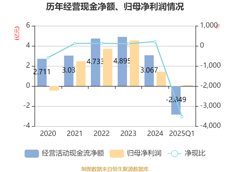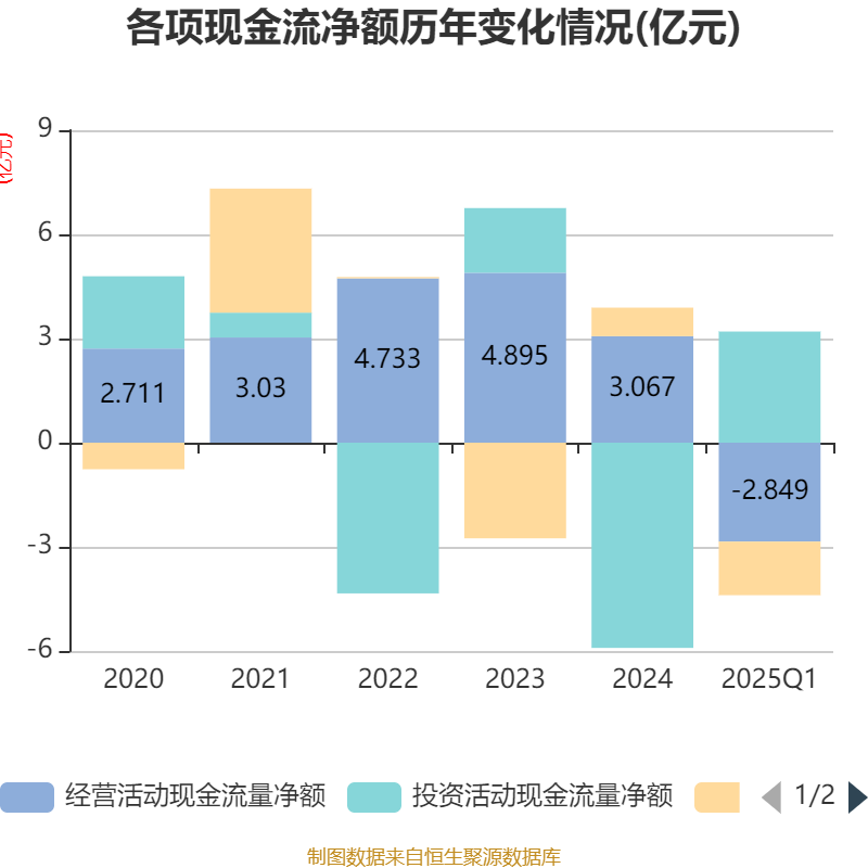 截至2025年一季度末百盛证券,公司经营活动现金流净额为-2.85亿元,同比减少2.56亿元;筹资活动现金流净额-1.54亿元,同比减少3.81亿元;投资活动现金流净额3.2亿元,上年同期为-7262.23万元。