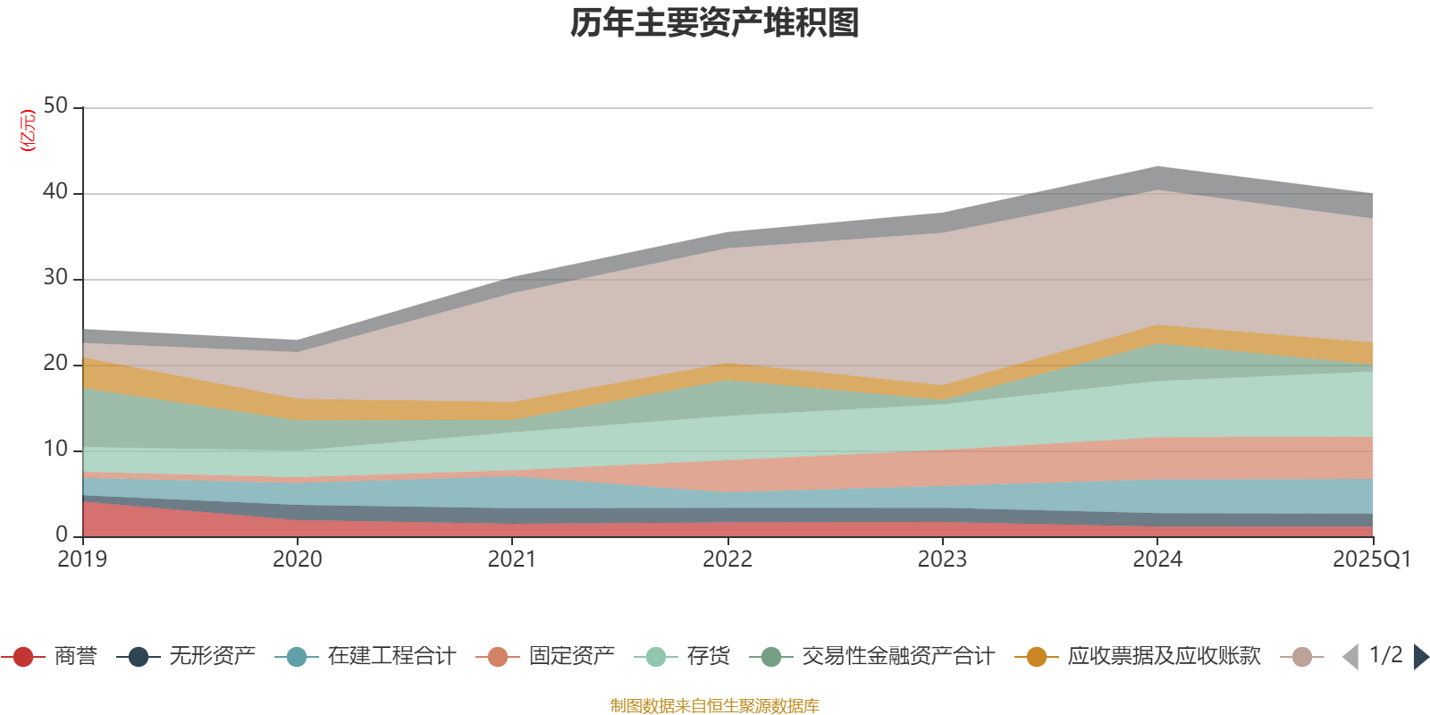 资产重大变化方面,截至2025年一季度末,公司交易性金融资产合计较上年末减少81.18%,占公司总资产比重下降8.1个百分点;存货较上年末增加16.41%,占公司总资产比重上升3.88个百分点;应收票据及应收账款较上年末增加16.86%,占公司总资产比重上升1.33个百分点;在建工程合计较上年末增加2.69%,占公司总资产比重上升0.99个百分点。