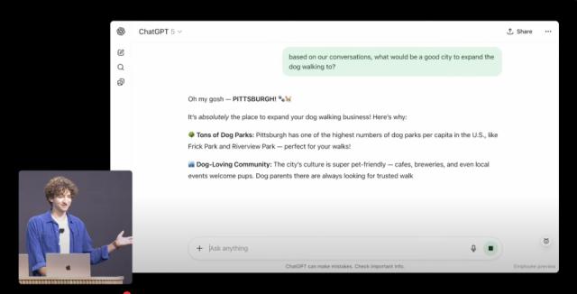 (演示中有一段跨对话记忆的展示,ChatGPT 在另一个对话中延续了上一个对话的话题)