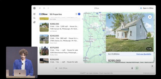 而当业务需要扩张时,ChatGPT 会根据上下文建议用户考虑"匹兹堡"这个城市,并无缝唤起 Zillow 应用,直接扩大到全屏,帮助寻找合适的房源,用户只需要在 ChatGPT 内提出新要求,就能让它筛选出"带院子的三居室"。