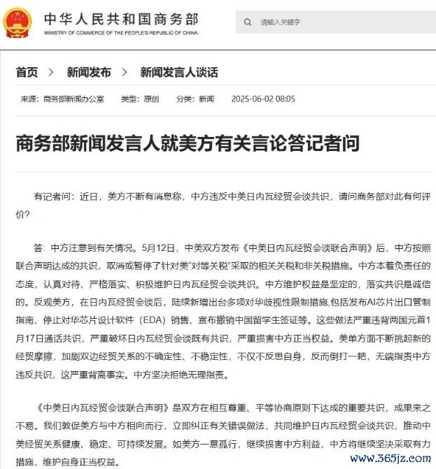 答: 中方注意到有关情况。5月12日,中美双方发布《中美日内瓦经贸会谈联合声明》后,中方按照联合声明达成的共识,取消或暂停了针对美“对等关税”采取的相关关税和非关税措施。中方本着负责任的态度,认真对待、严格落实、积极维护日内瓦经贸会谈共识。中方维护权益是坚定的,落实共识是诚信的。反观美方,在日内瓦经贸会谈后,陆续新增出台多项对华歧视性限制措施,包括发布AI芯片出口管制指南、停止对华芯片设计软件(EDA)销售、宣布撤销中国留学生签证等。这些做法严重违背两国元首1月17日通话共识,严重破坏日内瓦经贸会谈既有共识,严重损害中方正当权益。美单方面不断挑起新的经贸摩擦,加剧双边经贸关系的不确定性、不稳定性,不仅不反思自身,反而倒打一耙,无端指责中方违反共识,这严重背离事实。中方坚决拒绝无理指责。
